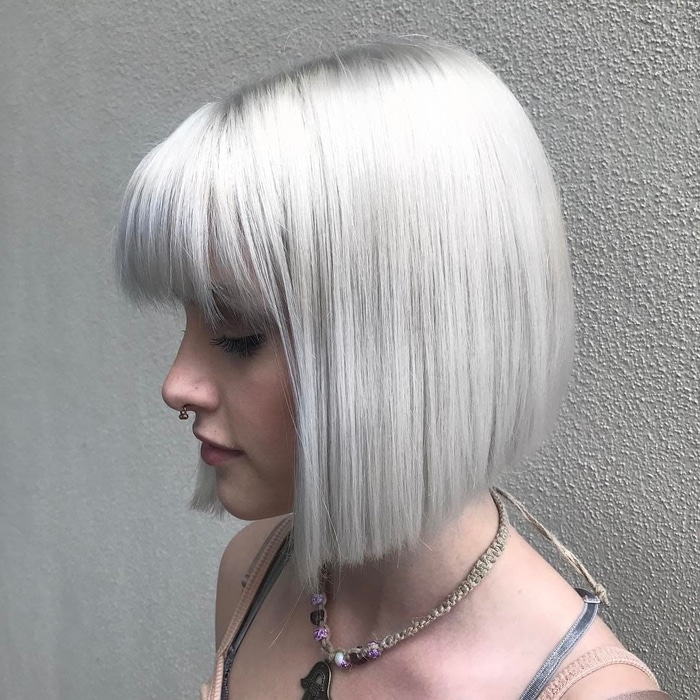 Blond platine sur une coupe carrée droite avec frange est très à la mode.
