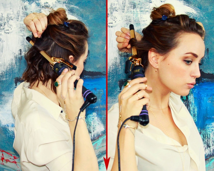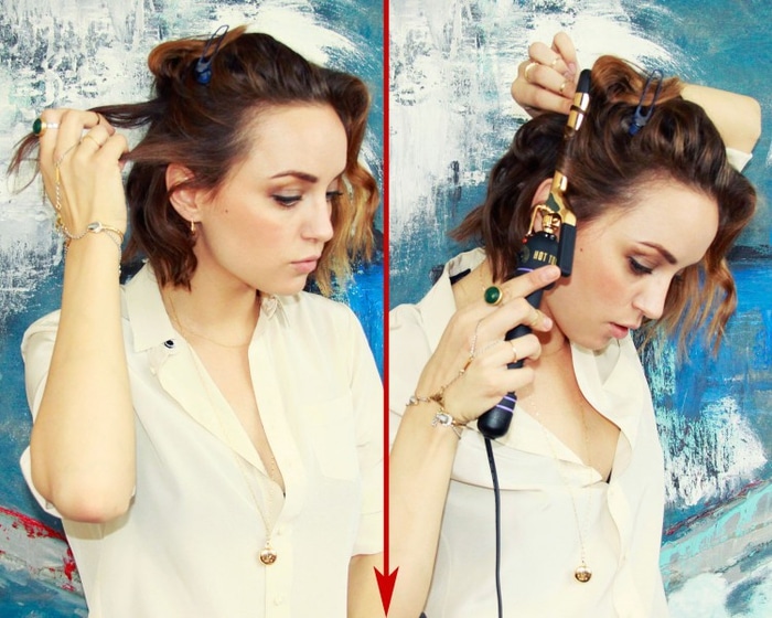 2. À l’aide d’un fer à boucle d’un diamètre de 13 mm, faire des ondes lumineuses sur tous les longs brins avant. Commencez par la longueur moyenne des cheveux et allez aux pointes.