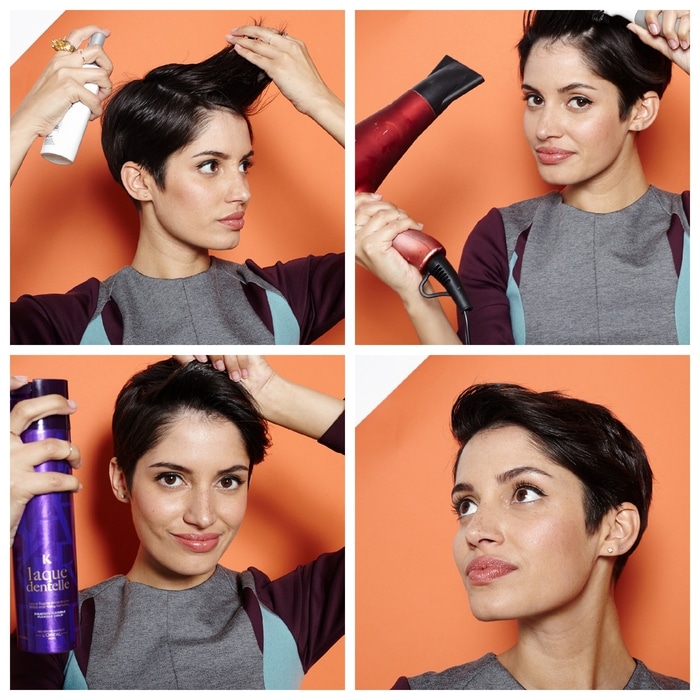 Pour atteindre cette coiffure, brosser les cheveux en arrière et suivre les mouvements avec un sèche-cheveux équipé d’une pointe.