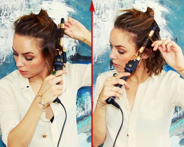 • Prenez une mèche de 3-5 cm de large et enveloppez-la autour d’un fer à friser (16 -19 mm de diamètre). Pour un effet petit, désordonné et plus naturel, enveloppez les cheveux près de la racine autour du fond du fer à friser. Continuer à envelopper le reste de la mèche à la pointe du fer. Ne pas envelopper les pointes.